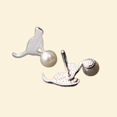 This unique asymmetrical pair features two different designs: one stud shows a cat sitting poised and polite, while the other captures a cat in mid-pounce. Both are playfully interacting with a lustrous Pearl, turning a classic jewelry element into their favorite toy ball.